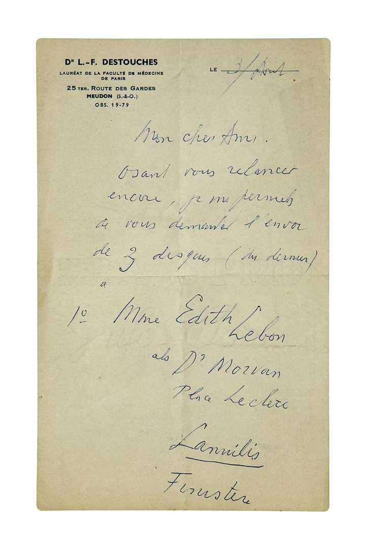 L.A.S. «Louis Destouches», Meudon 3 août [1957, à Paul CHAMBRILLON] | 2 pages in-8 à son en-tête Dr L.-F.