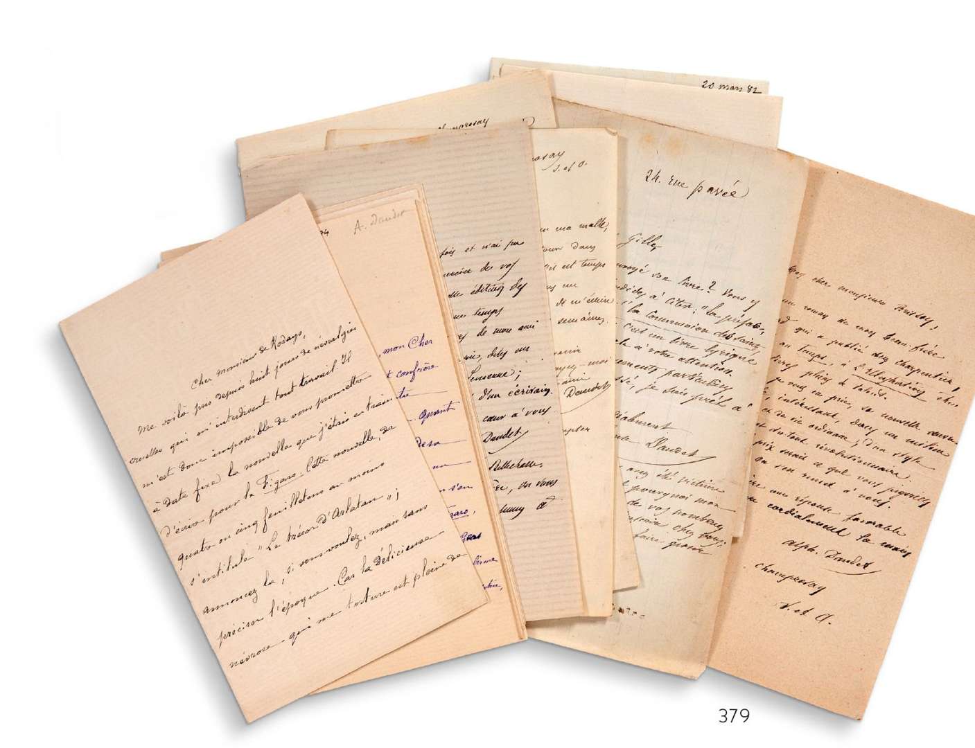 - Sept lettres à des destinataires inconnus, non datées sauf une, 20 mars 1882, Paris. Lettres entre une demi-page et une page in-16.