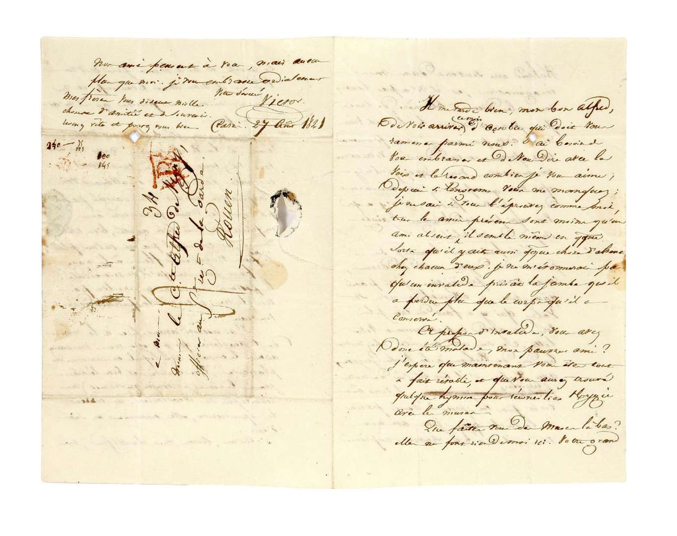 L.A.S. «Victor», Paris 27 août 1821, au comte Alfred de VIGNY «officier au 5e regt de la garde à Rouen» | 3 pages et quart in-8 et adresse (petite déchirure au dernier feuillet par bris du cachet).