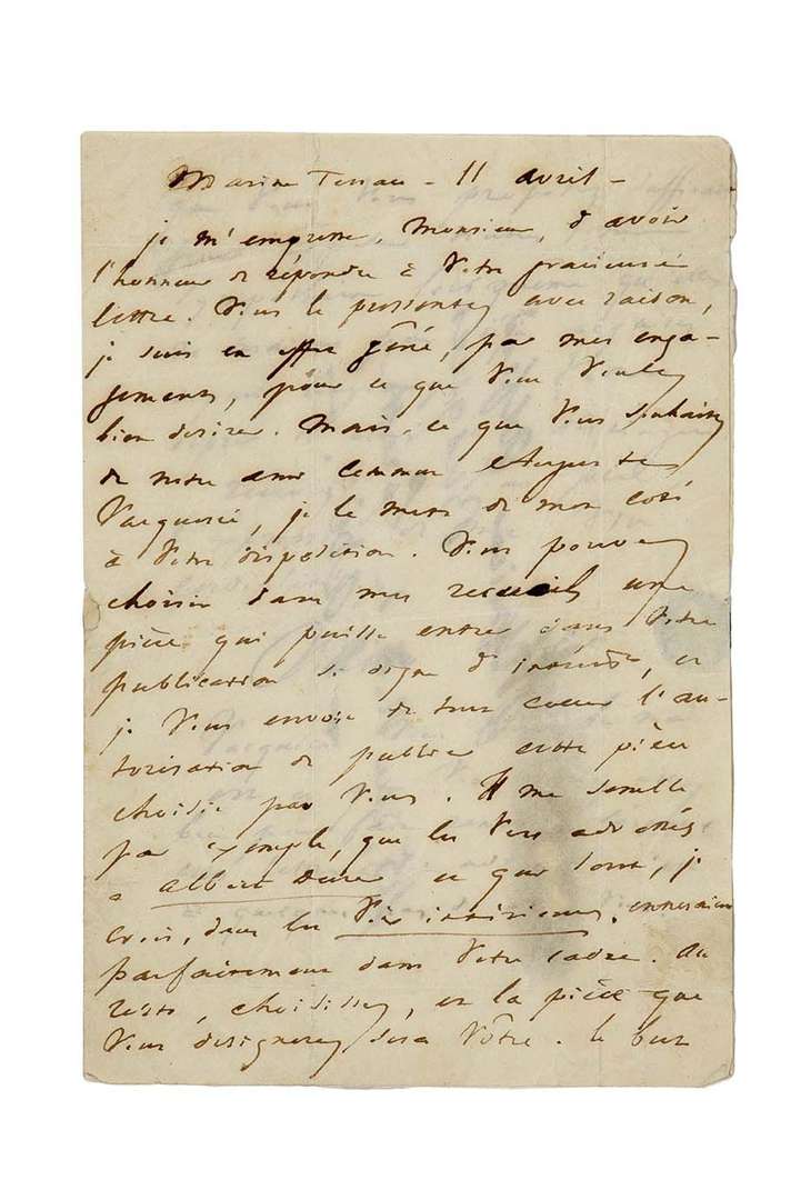 Il l'autorise à «choisir dans mes recueils une pièce qui puisse entrer dans votre publication si digne d'intérêt [...] Il me semble par exemple, que les vers adressés à Albert Durer et qui sont, je crois, dans les Voix intérieures, entreraient parfaitement dans votre cadre. Au reste, choisissez, et la pièce que vous désignerez sera vôtre. Le but que vous vous proposez suffirait pour appeler toutes mes sympathies lors même qu'elles ne seraient pas déjà acquises depuis longtemps à votre esprit si clair et si distingué»...