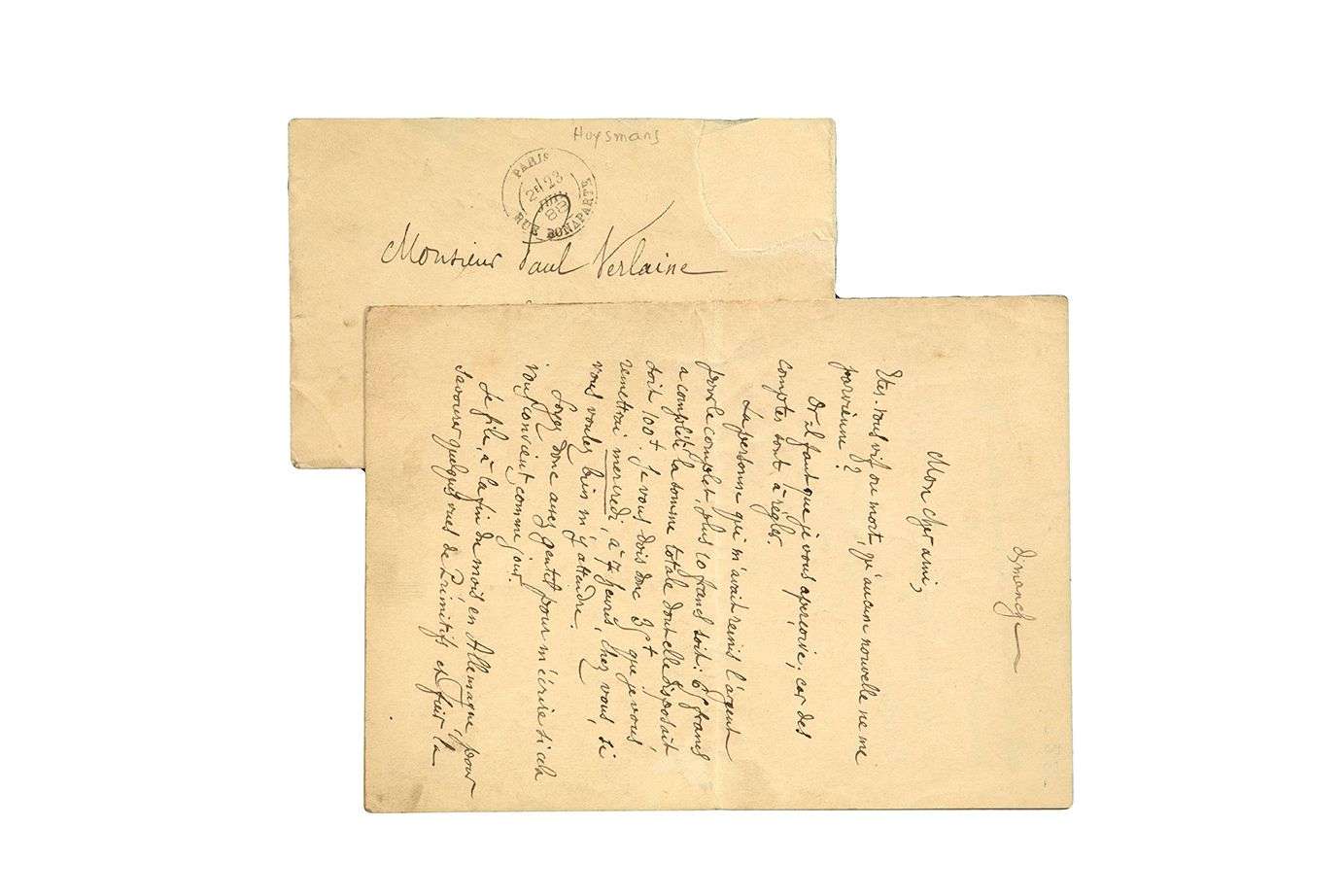 L.A.S. «JKHuysmans», [Paris 23 juillet 1888], à Paul VERLAINE | 1 page et demie in-8, enveloppe.