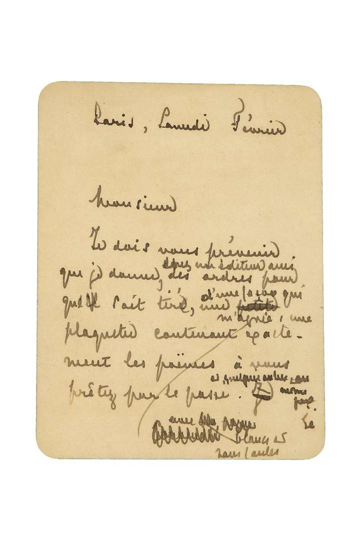 L.A. (minute), Paris Samedi février [1887 ?, à Léon VANIER] | 2 pages in-12 (carte), avec de nombreuses ratures et corrections.