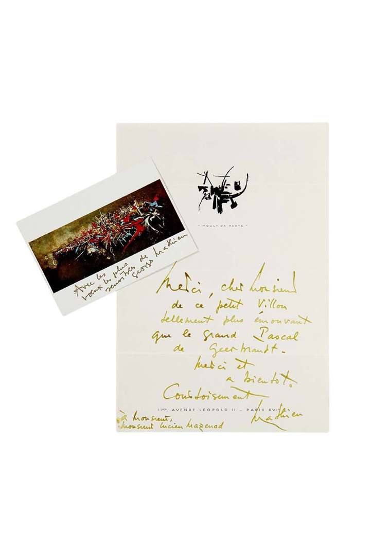 On joint une L.A.S. de Georges MATHIEU à Lucien Mazenod, remerciant pour l'envoi d'un livre de Villon (1 p. in-4 à vignette, enveloppe) | plus une carte postale de voeux.