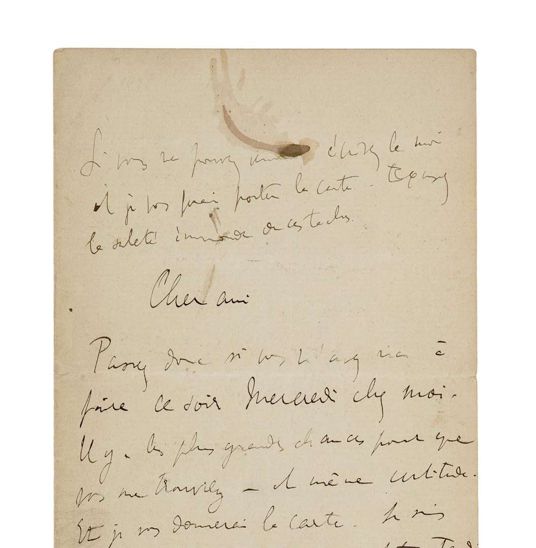 Malade, Proust propose à son ami de passer chez lui récupérer une carte : «Il y a les plus grandes chances pour que vous me trouviez - et même certitude». Il lui donnera cette carte : «Je suis ravi que vous puissiez en profiter Jeudi et samedi. Vous me la renverrez Samedi soir et ainsi je pourrai en faire profiter quelqu'un d'autre dimanche». Il termine : «À ce soir j'espère, je suis bien malade mon pauvre ami»...En haut de la première page, Proust a ajouté : «Si vous ne pouvez venir écrivez le moi et je vous ferai porter la carte. Excusez la saleté immonde de ces taches».