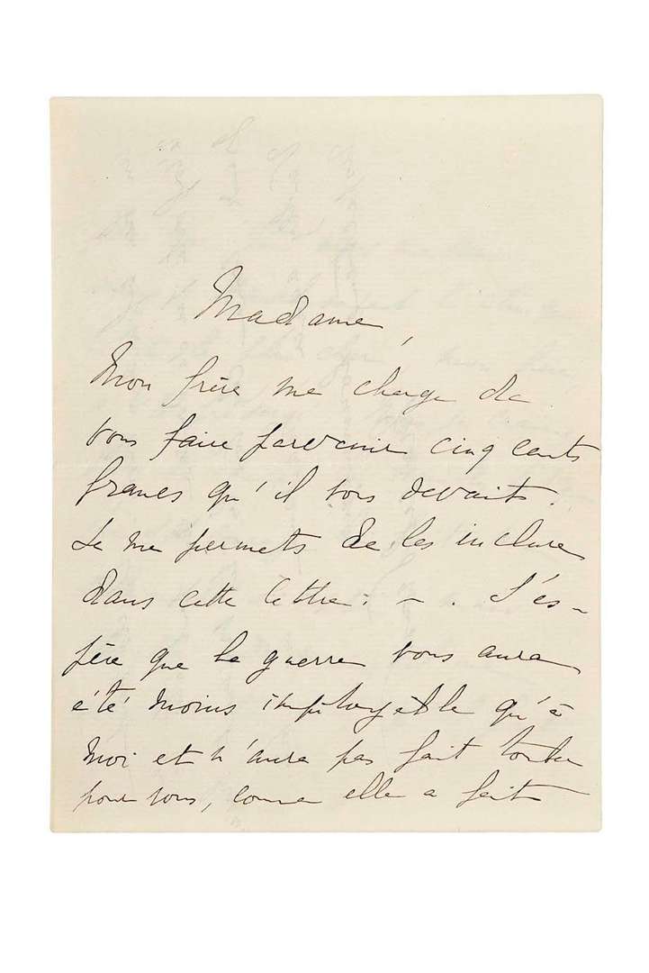 «Mon frère me charge de vous faire parvenir cinq cents francs qu'il vous devait. Je me permets de les inclure dans cette lettre. J'espère que la guerre vous aura été moins impitoyable qu'à moi et n'aura pas fait tomber pour vous, comme elle a fait pour moi, tous vos meilleurs amis.