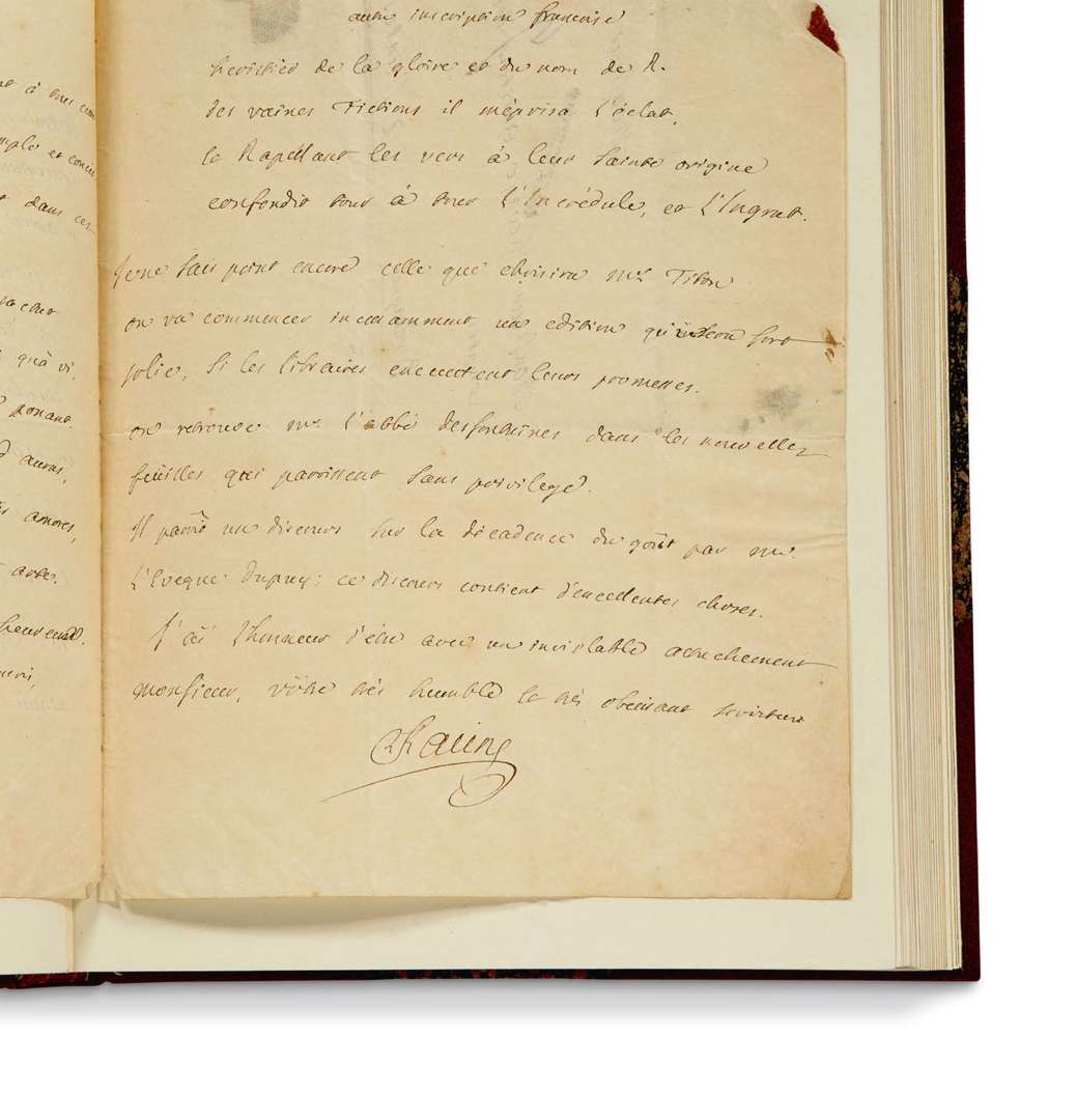 19 L.A.S. «Racine», Soissons et Paris 1744 - 1757, à René CHEVAYE à Nantes ou Clisson | 51 pages in-4, adresses avec cachets de cire aux armes(défauts à quelques lettres), montées sur onglets sur cartes fortes | le tout relié en un volume in-4 demi-maroquin grenat à coins avec filets dorés, dos à nerfs orné de filets dorés, tranches dorées (Marot-Rodde).