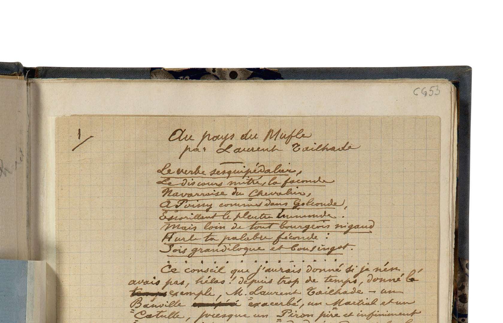 Pléiade (p. 744 - 746). Notre manuscrit est en grande partie inédit. De nombreuses variantes apparaissent dès le début, tandis que la seconde moitié, plus étendue, avec quelques ratures et corrections, offre une tout autre rédaction. Verlaine analyse et cite d'autres strophes de Tailhade que dans le texte édité. Citons une partie de la conclusion du manuscrit, qui donne quelques éclaircissements sur l'histoire de ce texte : «Qu'ajouter qui ne soit déjà de la redite, car voilà déjà passablement de mois qu'a paru le Pays du Mufle ? Dieu, d'ailleurs, m'est témoin que le présent articulet fut écrit à l'éclosion du délicieux terrible bouquin, et que plusieurs journaux, sollicités, ont poliment éconduit ces lignes pourtant bien gentilles et toutes bonasses ! Est-ce le titre du volume prôné qui aura effarouché les naturels de ces lieux, comme quelque allusion à quelqu'un là ? [...] Ceci paraîtra, où et quand ? mais paraîtra, quand ce devrait être de force ! Je ferai quelque jour l'histoire de ce petit travail et de son odyssée tragi-comique... Cependant, Laurent Tailhade travaille à une série de Ballades auprès de quoi le libelle dont il est question en ce moment frise la fadeur !! Et qu'il fait donc bien, et que c'est aimable de sa part de nous donner encore à rire (et à admirer), de