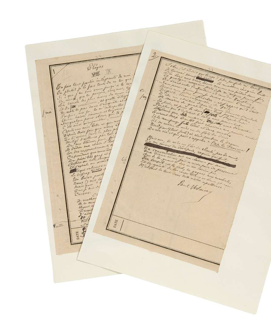 POÈME autographe signé «Paul Verlaine», Elégies IX, [1893] | 2 pages grand in-8 au dos de papier administratif de l'Assistance publique (montage à fenêtre).
