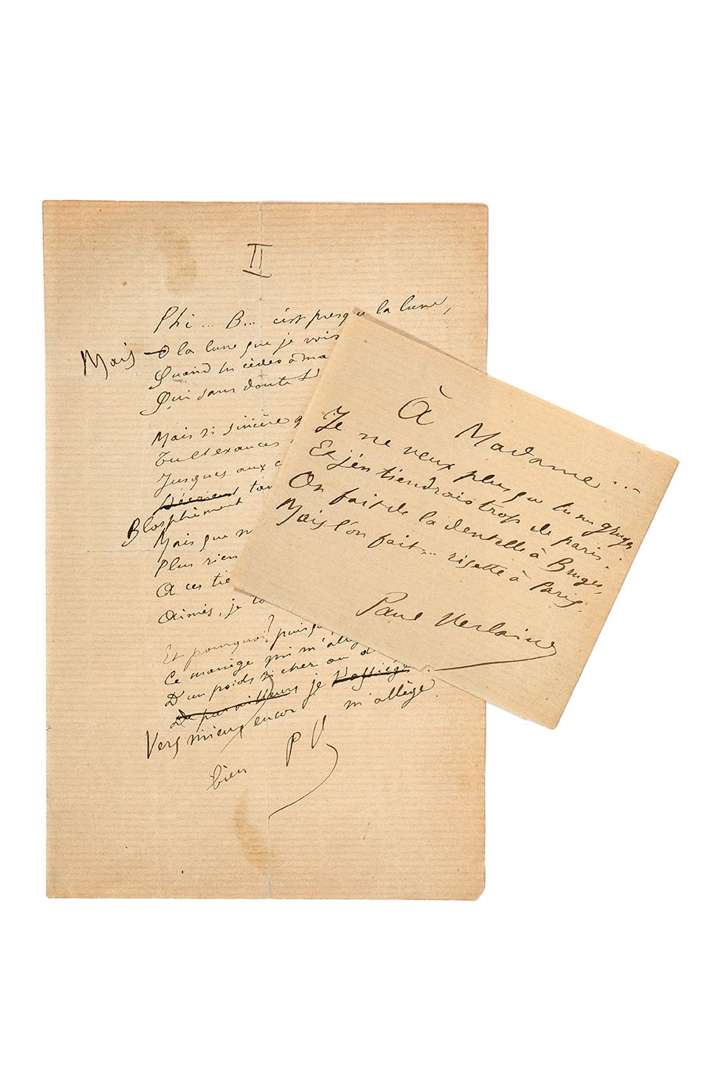 On joint un quatrain autographe signé «Paul Verlaine», À Madame... (1 page in-12) : «Je ne veux plus que tu me gruges»...