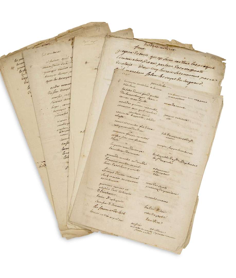Histoire naturelle (4 pages d'un bifolium numéroté 115). «Les peches viennent de Perse, les abricots d'Iberie [...] Lanalize ne peut faire connaitre la composition des corps | mettez dans un alambique une composition de farine, d'oeufs, de creme, de ris de veau, quel est le chimiste qui devinera que c'était un petit paté ? [...] Tout le gibier des alpes a les pattes velues il vit dans la nege, la nature pourvoit à tout. [...] A Strasbourg les bouchers ont un secret pour empecher les mouches d'aprocher, il faut que Reaumur invente ce secret. [...] Les singes nommez boggo, orang outan, baboon s'acouplent avec les femmes, et il n'est pas impossible qui ny en ait de la race. [...] Chez les hottentots le chef du village pisse sur l'échine des nouveaux mariez, c'est leur eau bénite»... Etc.