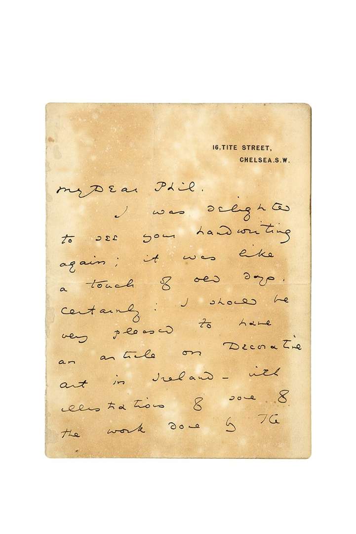 Il serait heureux d'avoir un article sur l'art décoratif en Irlande, illustré par les travaux d'aiguille («needle-work») fait à Clare Street par la baronne au nom bizarre («The Baroness with the amazing name»), leu bois gravé («carved wood») fait dans le Sud, et une petite dentelle.