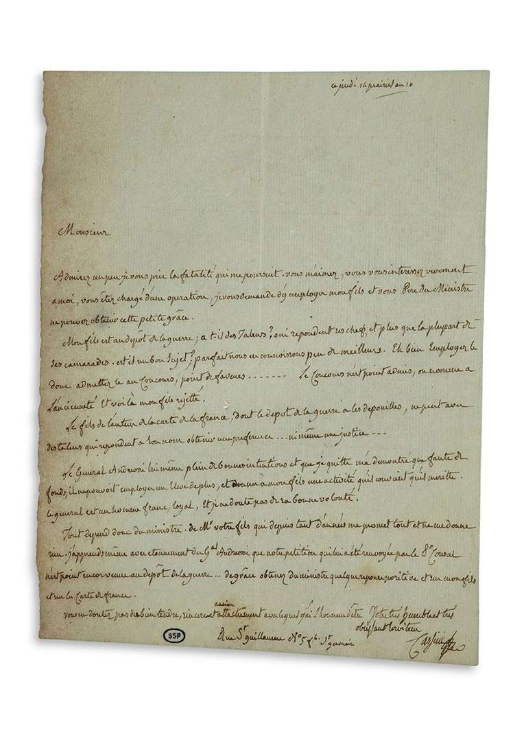 Il prie son correspondant d'intervenir auprès du Ministre de la Guerre en faveur de son fils... «Mon fils est au dépôt de la guerre | a-t-il des talens ? oui répondent ses chefs, et plus que la plupart de ses camarades.