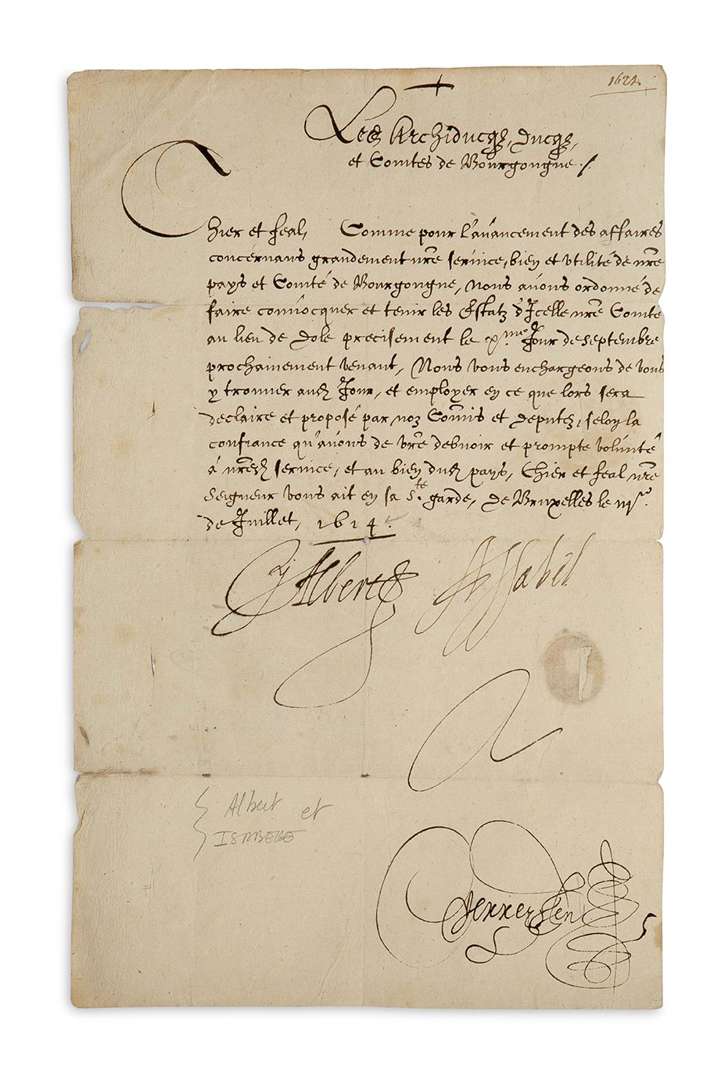 L.S. par les deux «Albert» et «Ysabel», Bruxelles 3 juillet 1614, au Sieur de FALON | 1 page in-fol., adresse au verso.