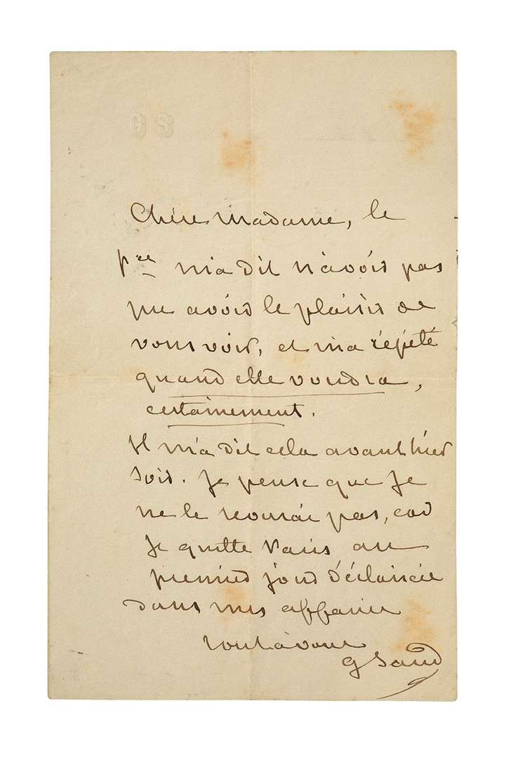 On joint une L.A.S. de George SAND à Mme Paul Talma, [30 mai 1869] (1 p. in-8).
