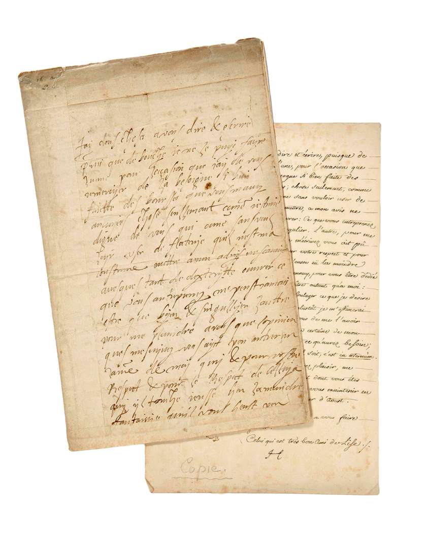 «Jay deux choses a vous dire & ecrire puis que de bouche je ne le puys fayre. Lunne pour loccasion que jay de vous remercier de la besoigne si bien faitte des boursses que vous mavez anvoyées chose seullemant comme jestime digne de vous qui comme sans vouloyr user de flaterye quil nest ma coustume mettre a mon advis ne scauroyt avesques tant de dexterytté ouvrer, ce que vous antreprenez ne peust jamais estre que byen & singullyer. Laultre pour me plaindre a vous que lopinion ques mescryvez vous ayst peu antrer an lame de moy quy & pour vostre respect & pour le respect de celluy a quy yl touche jeusse heu la moindre fantaisie quil vous heust peu aporter annuy pour vous estre dedie amy & desirer plus je vous fayre paroystre qua autant que moy & sil vous aigy que jaye moyen de soulaiger ce que je desire infinimant quyl le soyt quy est vous plus tost je mestimeray contant & heureus lavoyr faict que vous de me lavoyr mandé. Continuez donques a croyre & estre certayin de mon amytyé bonne voullontté & secours an tout ce quaurez besoing & que quand je suis amy [...] cest in eternum»... (Bords renforcés)