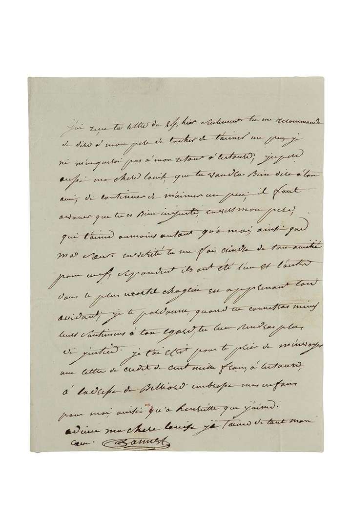 Elle lui a recommandé «de dire à mon père de tacher de t'aimer un peu, je ni menquerai pas à mon retour à Lectoure | jespere aussi ma chere Louise, que tu voudras bien dire à ton ami, de continuer de m'aimer un peu | il faut avouer que tu es bien injuste envers mon père, qui t'aime aumoins autant qu'a moi, ainsi que ma soeur. En vérité tu me fais crindre de ton amitié pour eux, sepandent ils ont été l'un et l'autre dans le plus mortel chagrin en apprenant ton accidant | je te pardonne, quand tu connetras mieux leurs santimens à ton egard, tu leur rendras plus de justice»...