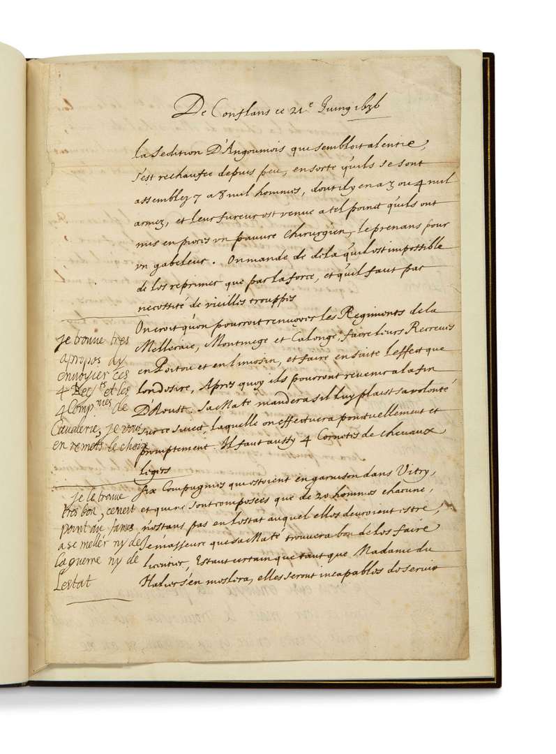 NOTES autographes en marge et au bas d'une lettre du cardinal de RICHELIEU, Conflans 21 juin 1636 | 2 pages et quart in-fol., adresse autographe par Louis XIII : «Pour mon Cousin le Cardal de Richelieu» : montée sur onglets et reliée en un vol. in-fol. chagrin brun, titre doré sur le plat sup., cadre int. avec triple filet doré (René Aussourd).