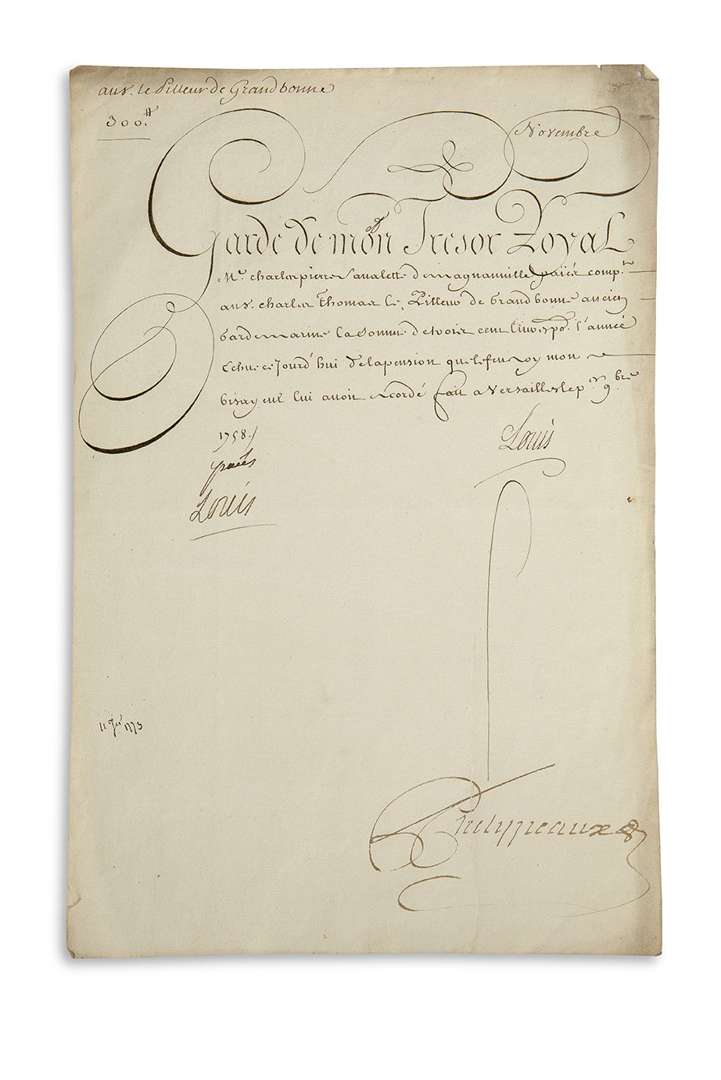 P.S. avec un mot autographe «paiés Louis», signée aussi par le secrétaire de la main, et contresignée par Phelypeaux, Versailles 1er novembre 1758 | 1 page in-fol.