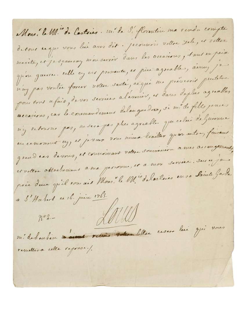 L.A.S. «Louis», Saint-Hubert 16 juin 1765, au marquis de CASTRIES | 1 page in4, adresse avec cachet de cire noire aux armes.