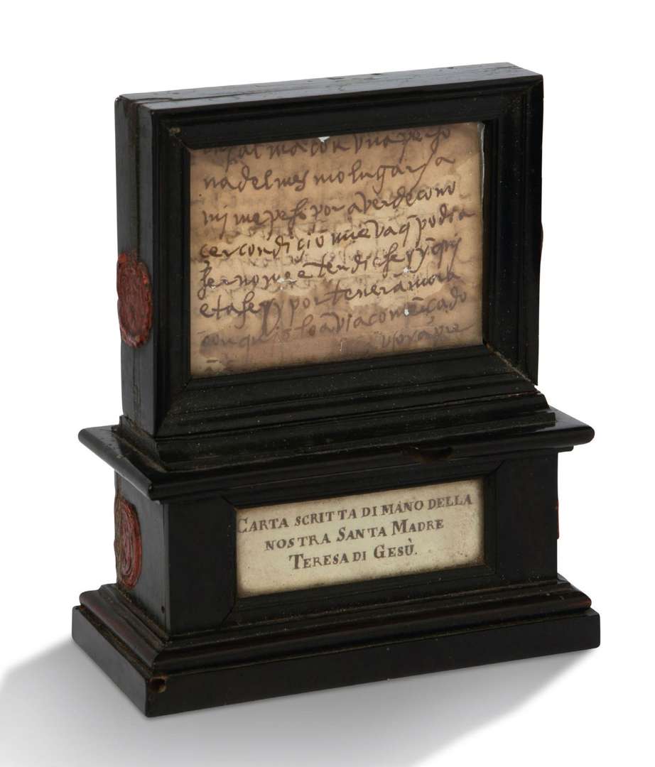 Il est conservé dans un petit présentoir en bois noir en forme de tabernacle | dans la partie inférieure, d'un côté, une inscription sur papier : «Carta scritta di mano della nostra Santa Madre Teresa di Gesù» | de l'autre côté, petites reliques reposant sur un coussin de velours rouge, avec une petite banderole portant l'inscription : «Ex Ossib S. Adiuti