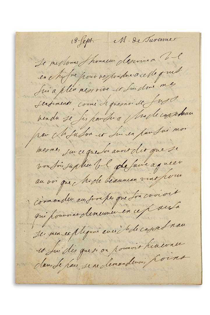 L.A.S. «Turenne», au camp de Binche 18 septembre [1654], [au cardinal MAZARIN] | 3 pages in-4, adresse «Pour Son EMinence»avec cachets de cire rouge brisés.