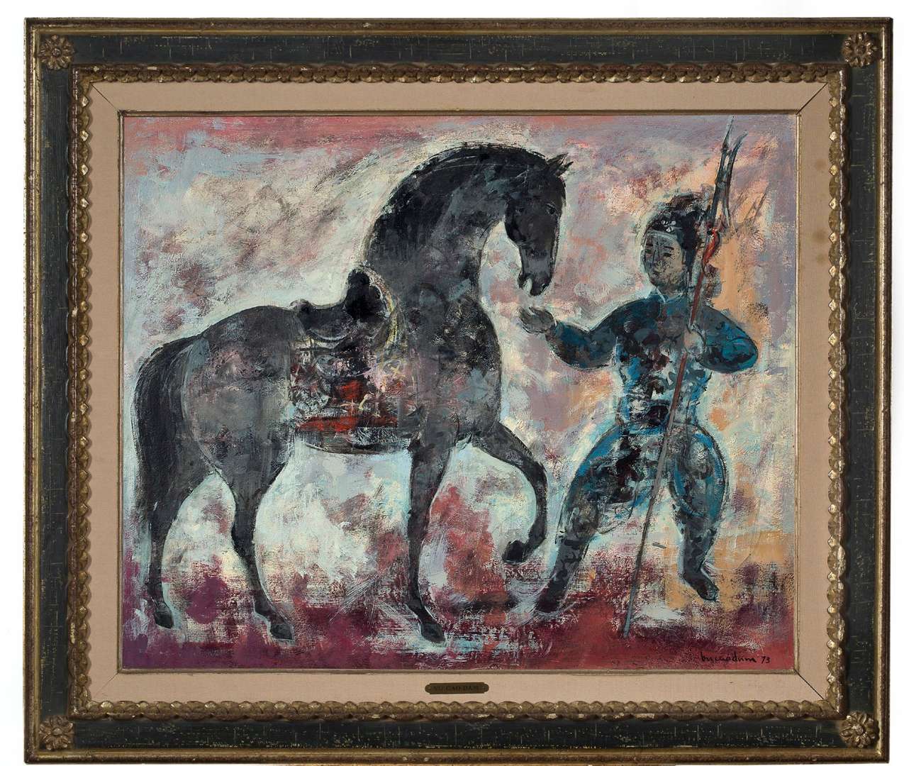 Le Guerrier est une remarquable synthèse du travail de Vũ Cao Đàm des années 1970. Réalisée en 1973, cette peinture représente une des sources d’inspiration les plus fortes de l’artiste. Il rappelle ainsi la symbolique forte entourant les chevaux en Asie. Évoquant le prestige mais aussi le pouvoir, ils ont été maintes fois représentés par l’artiste. La figure humaine est également un sujet indissociable de l’art du maître. La silhouette tout en rondeur du guerrier mais aussi sa tenue traditionnelle vietnamienne sont caractéristiques.
