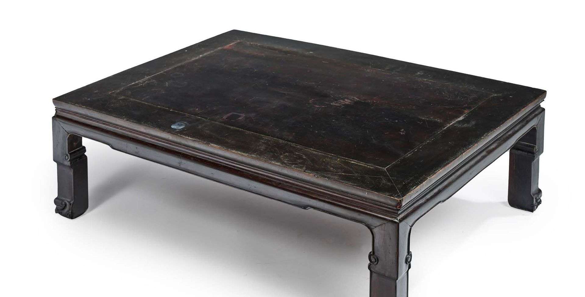 Table basse en bois naturel pour le piétement et en bois laqué pour le plateau, montée sur quatre petits pieds en forme de têtes de monstres soutenant le plateau rectangulaire, la ceinture moulurée. PROVENANCE Galerie Luohan, Paris (2000) Dim. 37 x 104 x 72 cm (Usures et taches au plateau)