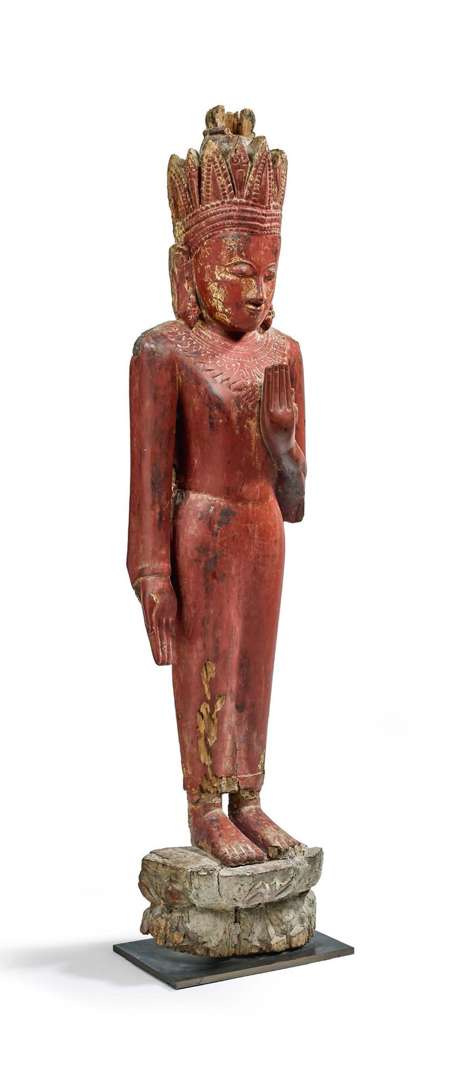 Sculpture en bois laqué rouge représentant un boddhisattva debout sur un socle paré d'une haute couronne et de riches bijoux, le visage aux yeux mi-clos exprimant la compassion, esquissant un léger sourire, sa main gauche au niveau du torse en abhaya mudra (geste de l'assurance), sa main droite le long du corps.