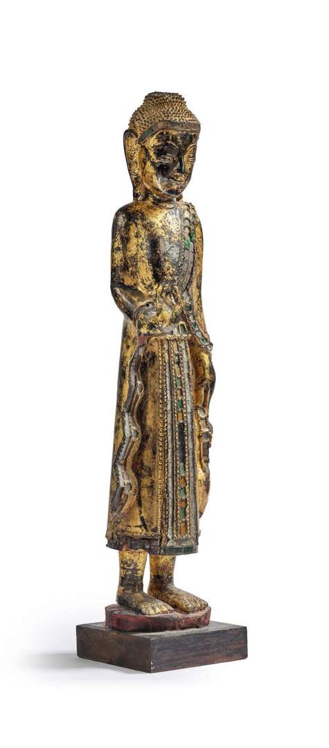 Statuette en bois laqué noir anciennement doré et incrustations de verroterie, représentant Bouddha debout sur un socle, la main droite en abhaya-mudra (absence de crainte) et la main gauche tenant un pli de sa robe, le visage aux yeux mi-clos exprimant la sérénité.