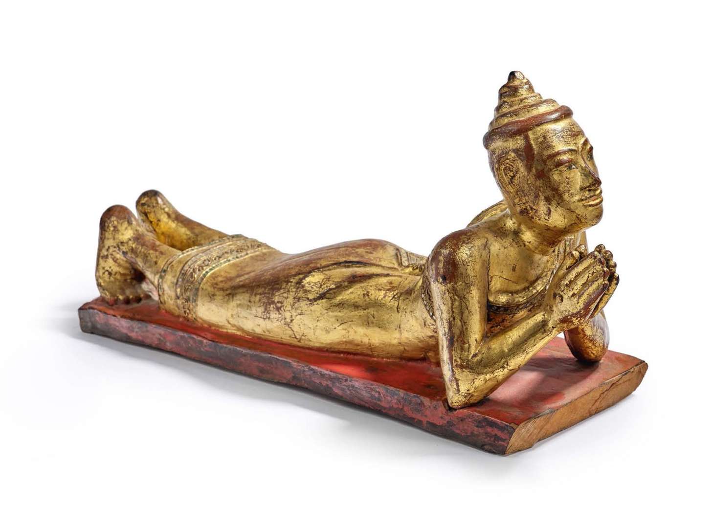 Sculpture en bois laqué rouge anciennement doré représentant un adorant couché, en prière, vêtu d'une robe monastique dont les pans sont ornés de motifs de fleurs et rinceaux en verroterie.