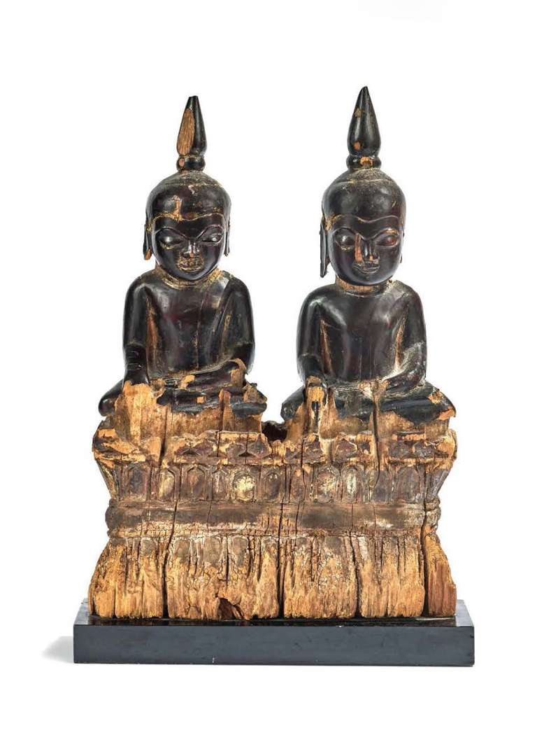 Sculpture en bois laqué brun représentant un groupe de deux bouddhas assis en bhumisparsa-mudra sur un socle lotiforme.