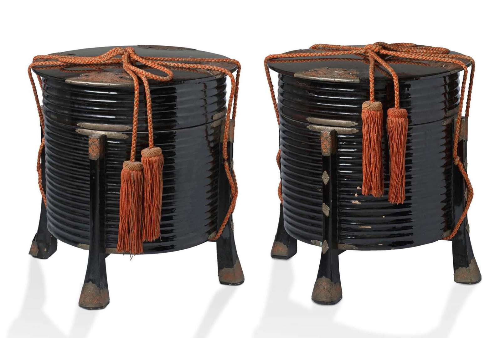 Paire de boîtes couvertes hokkai-bako ou karabitsu, en bois laqué brun noir reposant sur quatre pieds, le pourtour annelé, et renforts en laiton sculpté de motifs de fleurs géométriques.
