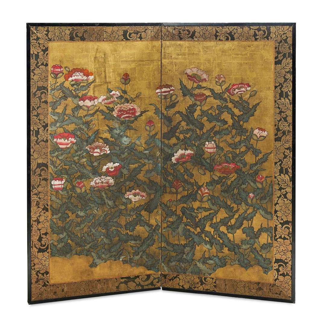 Paravent à deux feuilles à décor de pivoines et pavots, peint en polychromie sur fond or.