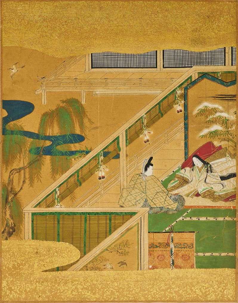 Ensemble de deux petites peintures encadrées à l'encre et couleurs sur papier dans le style de l'école Tosa, représentant des scènes du Dit du Genji.