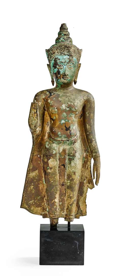 = Important bouddha couronné debout en samabangha, la main droite en abhaya mudra levée à hauteur des épaules, la main gauche tenant délicatement le pan de son vêtement. La tête ceinte d'une couronne ornée de rinceaux et fleurettes, les cheveux coiffés en un sobre chignon pyramidal. Le visage serein, l'expression bienveillante, les yeux mi-clos incrustés. Il est vêtu d'une fine robe monastique à pans relevés sur les côtés.