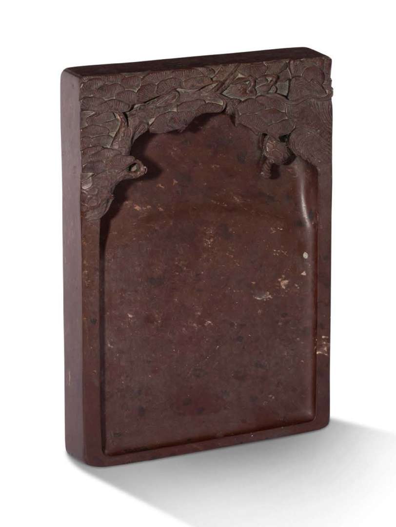 Importante pierre à encre rectangulaire sculptée, la partie supérieure à décor en relief d'un pin noueux étendant ses branches au-dessus d'une petite tortue, tous deux symboles de longévité. La pierre avec une belle teinte brun-rouge.