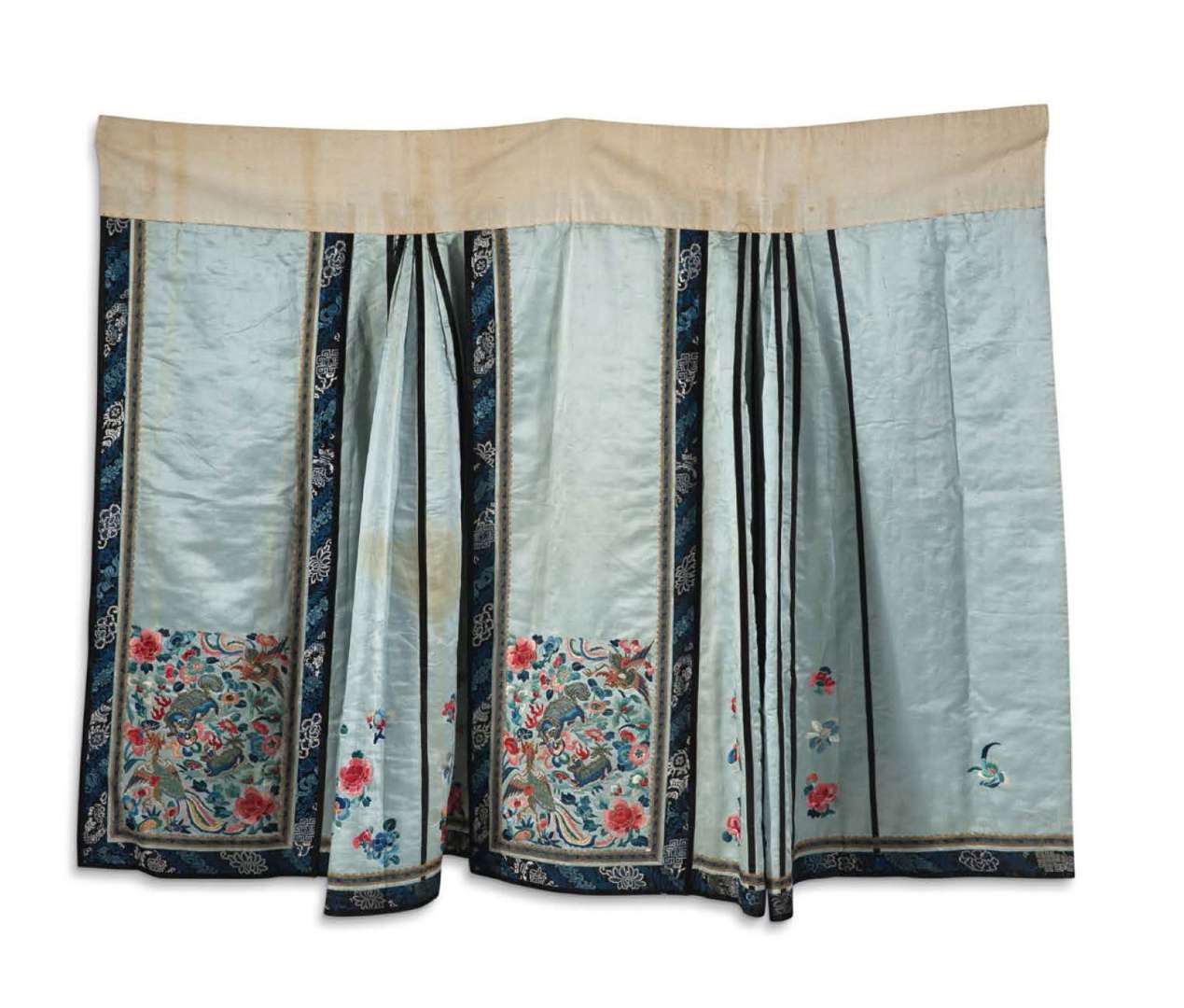 Jupe d'hiver molletonnée en soie bleu ciel, brodée aux fils de soie polychromes et dorés. Le panneau central décoré de lions bouddhiques et phénix parmi les fleurs.