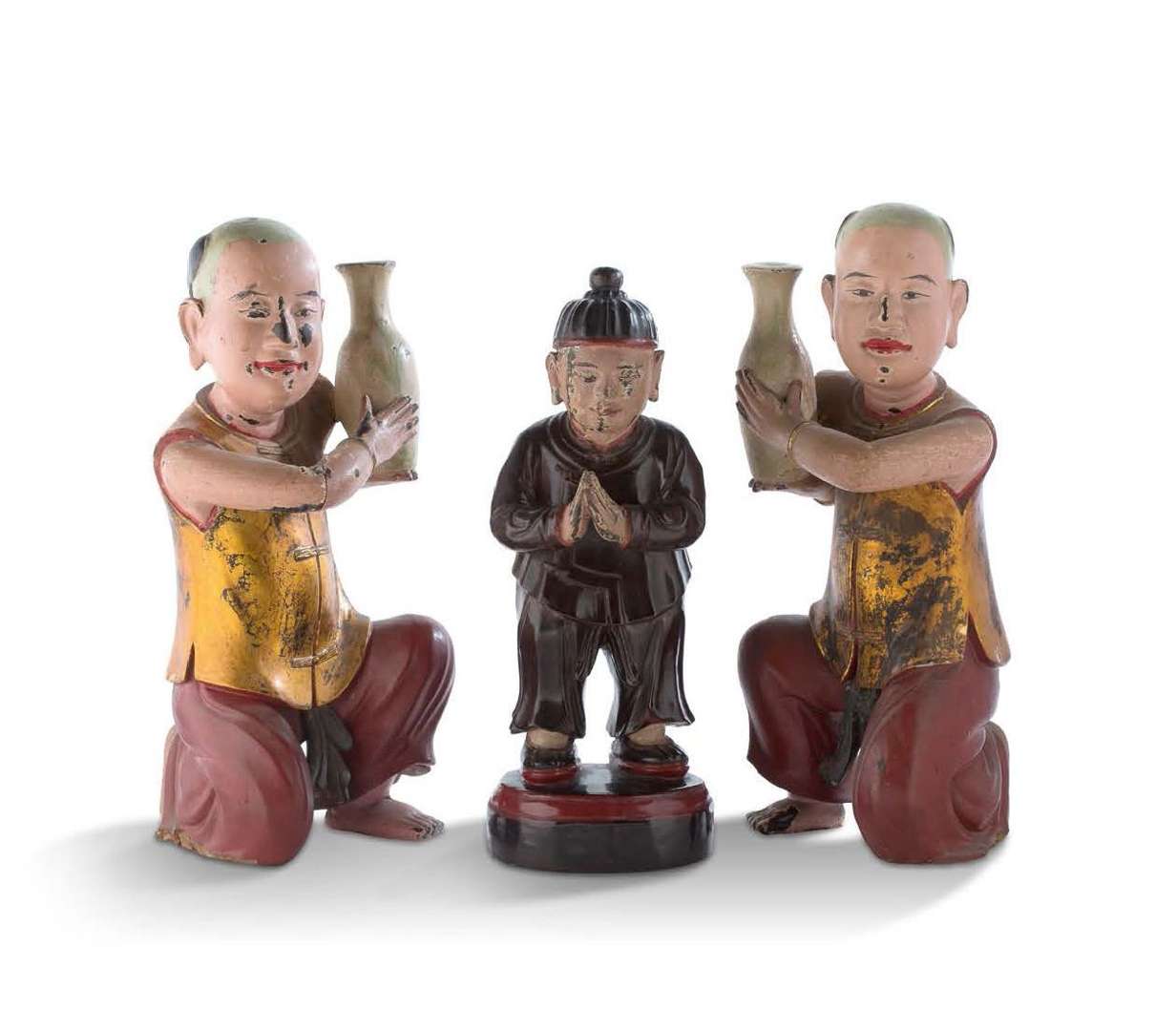 On y joint une statuette en bois laqué polychrome représentant un enfant aux mains jointes en signe de dévotion.