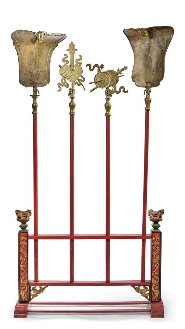 Importante suite de quatre grandes hampes de procession en bois laqué rouge et alliage de cuivre, terminées par des emblèmes bouddhiques rubannés ou un écran, toutes calligraphiées en partie basse et s'échappant de têtes de dragons. Elles sont montées sur un présentoir en bois laqué et doré, de forme droite, les montants terminés par des lions bouddhiques debout, à décor sculpté en léger relief d'oiseaux dans les prunus en fleurs et de chauves-souris. Dim. 232 x 124 x 36 cm (Manque au sommet de l'une des hampes et usures)