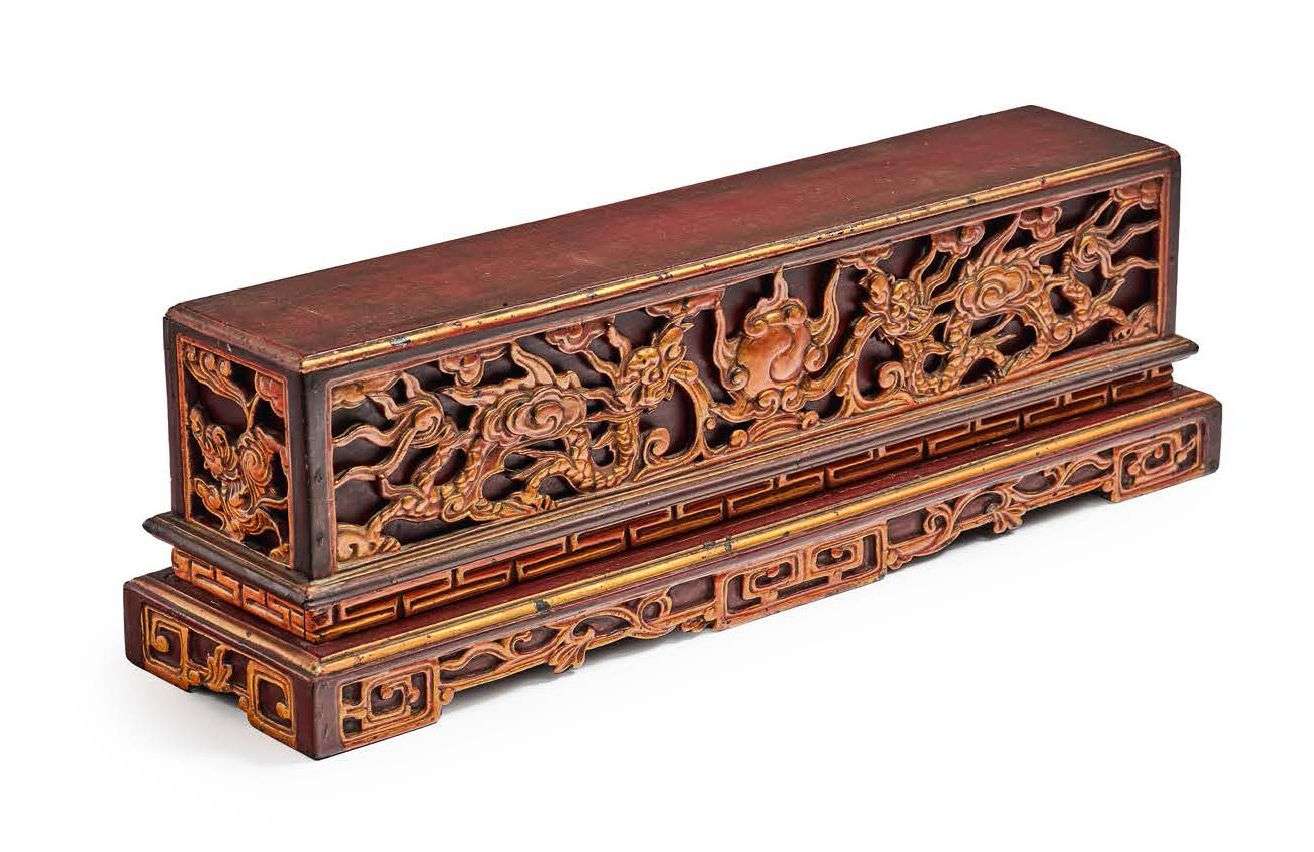 Coffret à décret rectangulaire en bois laqué brun-rouge et cuivré, le couvercle sculpté sur les grands côtés d'ajours représentant d'un côté des dragons crachant de l'eau encadrant la perle sacrée, de l'autre des phénix parmi des nuages stylisés.