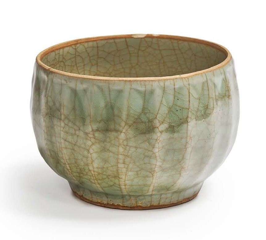 Bol à aumône en grès céladon de Longquan, reposant sur un court pied circulaire, la panse refermée avec des parois hautes, l'extérieur légérement godronné et rehaussé de motifs de pétales de lotus. Le bol avec une délicate couleur vert bleuté parcourue par un réseau de craquelures.