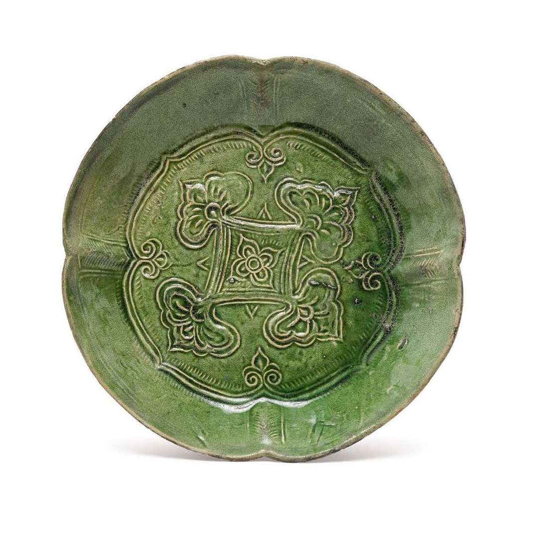 = Rare petit plat en grès à glaçure verte, de forme quadrilobée, l'intérieur moulé de motifs imitant les pièces d'orfèvrerie moyenne-orientales de la période. La pièce entièrement glaçurée dans une belle teinte vert vif.