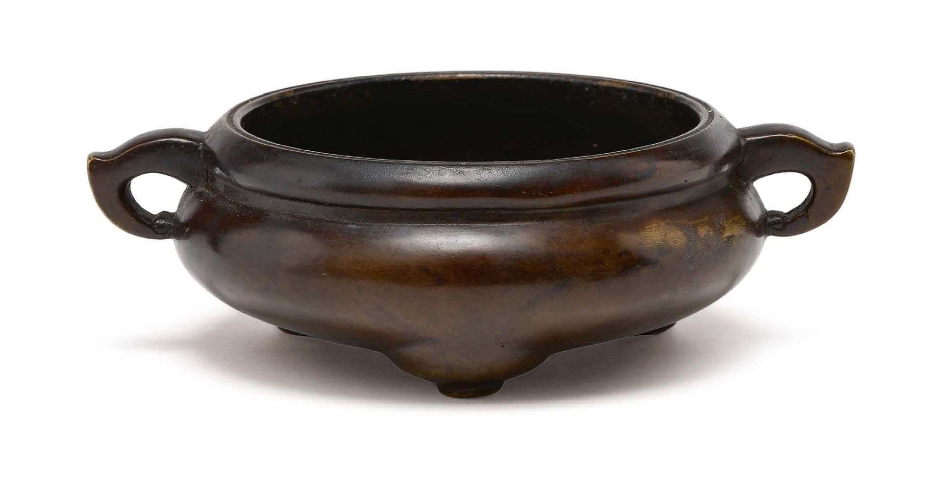 Brûle-parfum en bronze à patine brune, la panse globulaire aplatie encadrée par deux petites anses. Marque Da Ming Xuande Nian