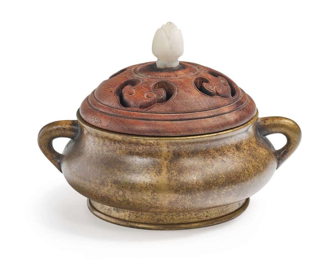 Avec un couvercle en bois ajouré de ruyi et une prise en albâtre en forme de bouton de lotus. Marque à quatre caractères sur la base.