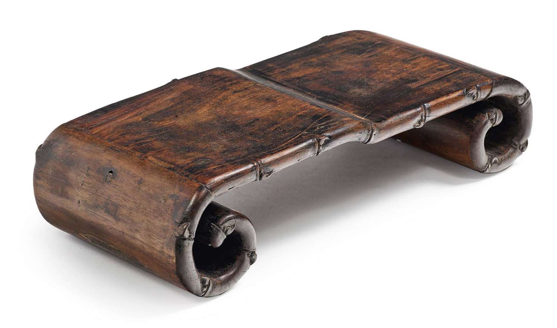 Petite table ou repose-poignet en bois naturel aux extrémités reprenant les enroulements des rouleaux, les côtés sculptés à l'imitation du bambou.