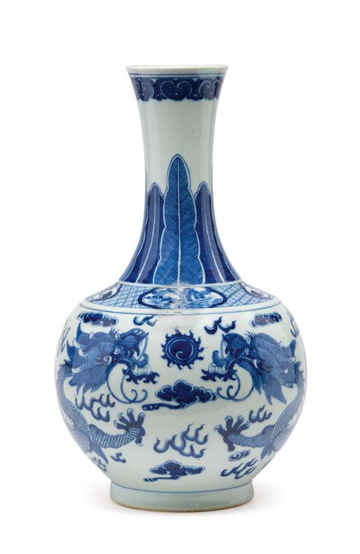 Vase en porcelaine bleu-blanc, la panse globulaire à décor de deux dragons à cinq griffes pourchassant la perle sacrée parmi les nuages et les flammes.