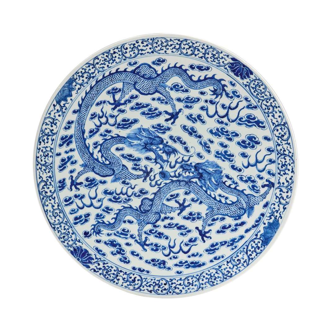 Importante plaque circulaire en porcelaine bleu-blanc à décor de deux dragons à quatre griffes pourchassant la perle parmi les nuages et les flammes, l'ensemble cerné par une frise de rinceaux.