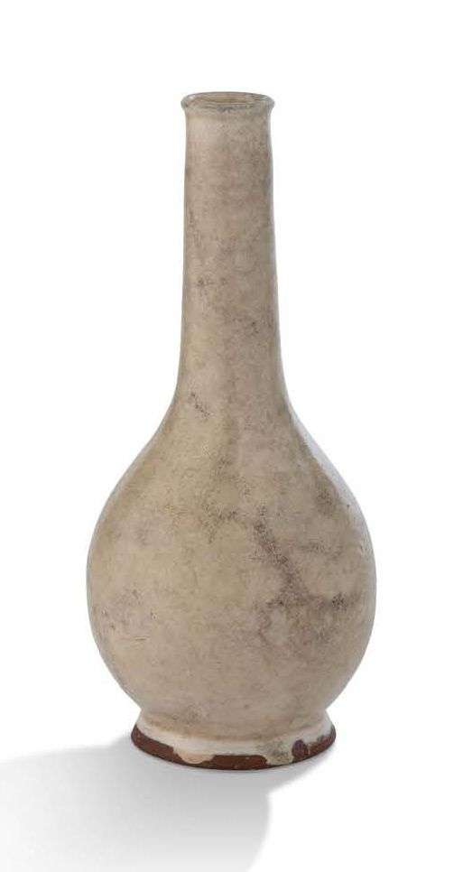 Petit vase bouteille en grès à couverte couverte crème, la panse arrondie s'allongeant en un long col.