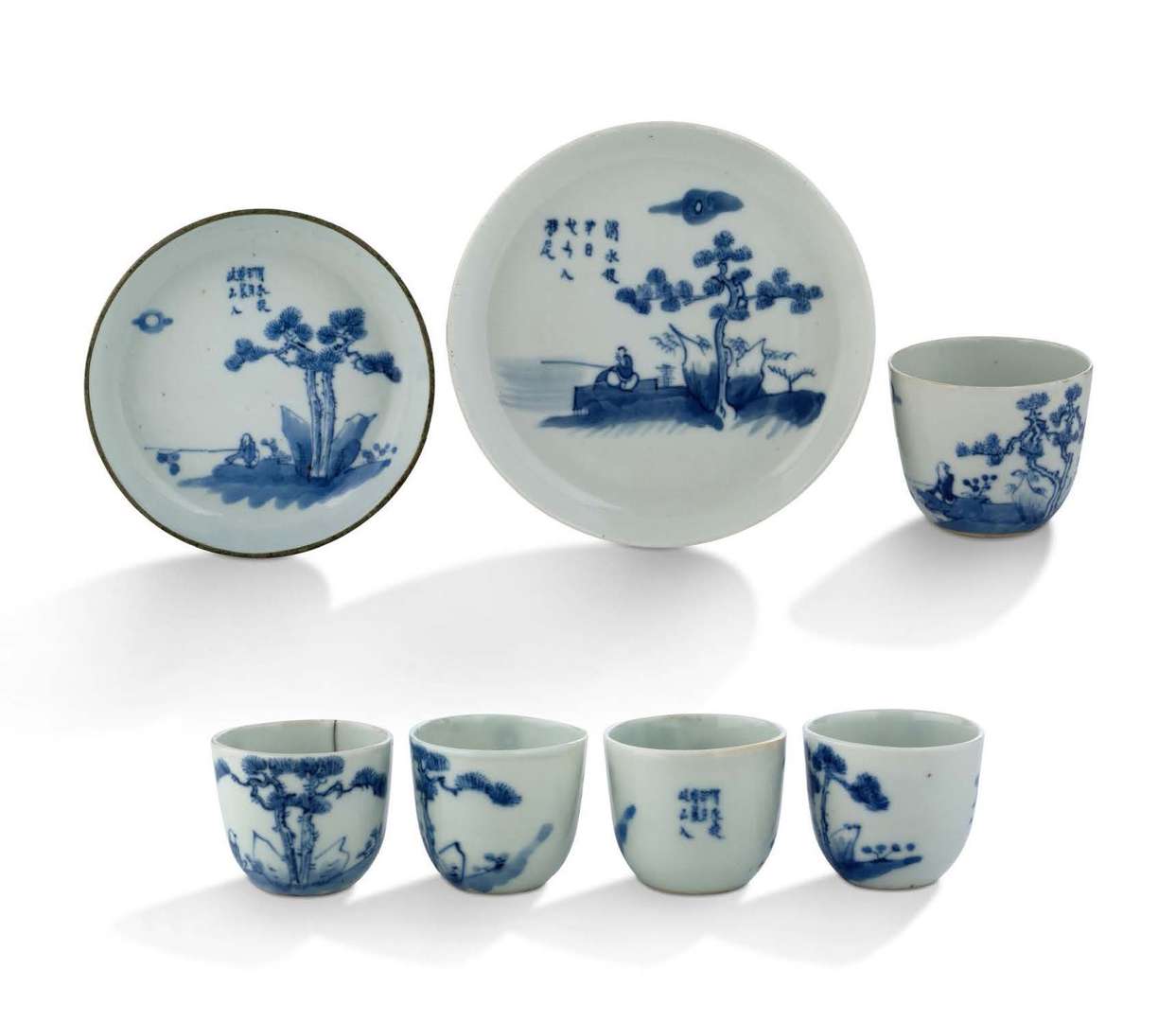 L'ensemble décoré d'une composition mettant en scène un pêcheur sous un pin, avec quelques vers d'un poème. Le petit plateau avec la lèvre cerclée de métal.