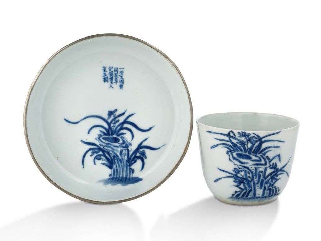 Ensemble comprenant une coupe-à-thé et un petit plat en porcelaine bleu-blanc à décor d'orchidées sauvages parmi les rochers, l'ensemble complété par quelques vers. La lèvre du plat cerclée de métal.